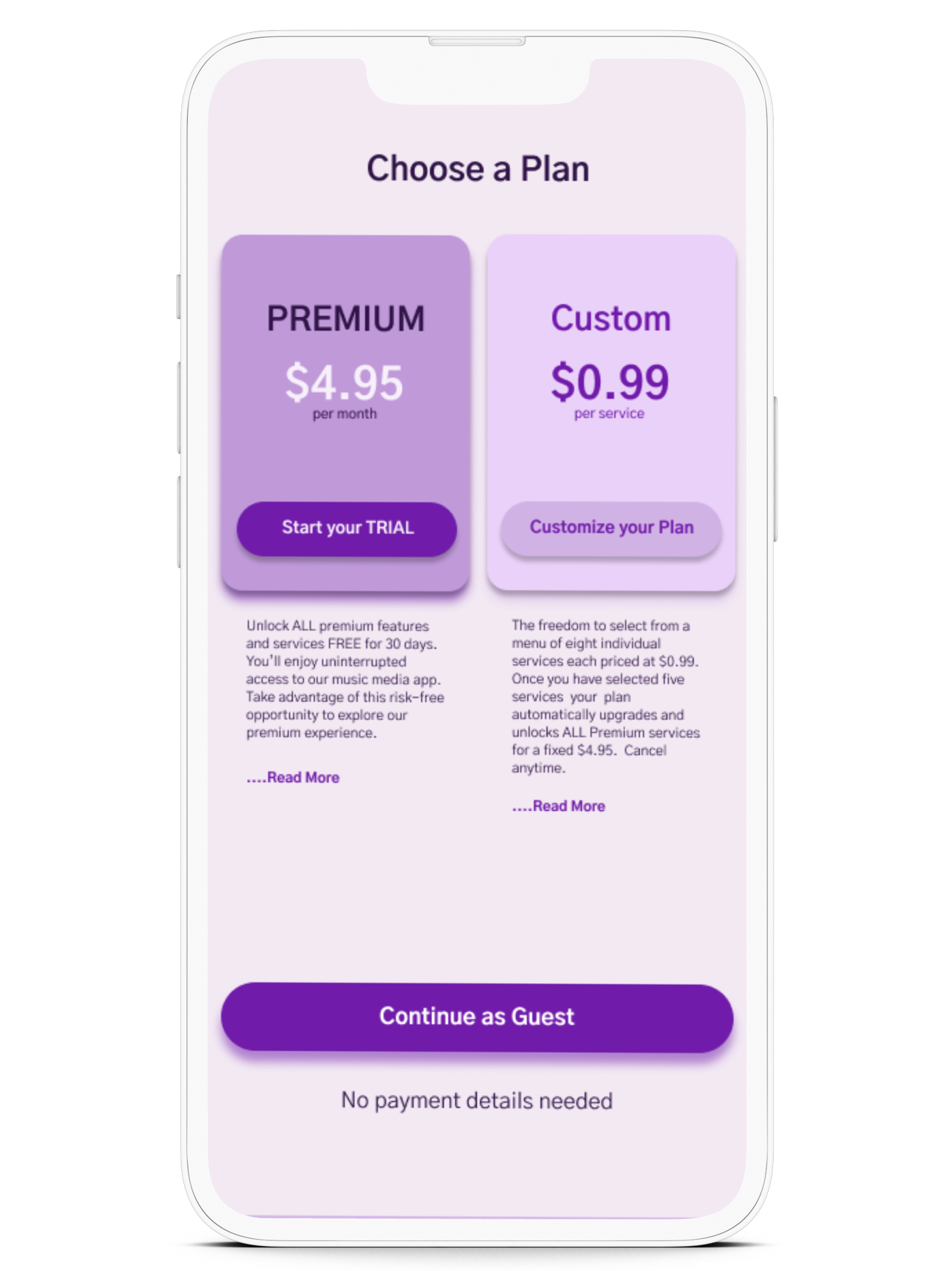 The idea was to enhance the user flow by incorporating a dedicated landing page within the existing sign-up process. This page would showcase the premium and customized plans with prices with the option to subscribe to either plan seamlessly during registration or to opt out and continue as a guest allowing the user to first browse before making the paid commitment. Additionally guests users would be provided the opportunity to upgrade their plan with a clear Call-to-Action from the guest home screen.