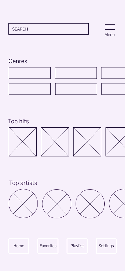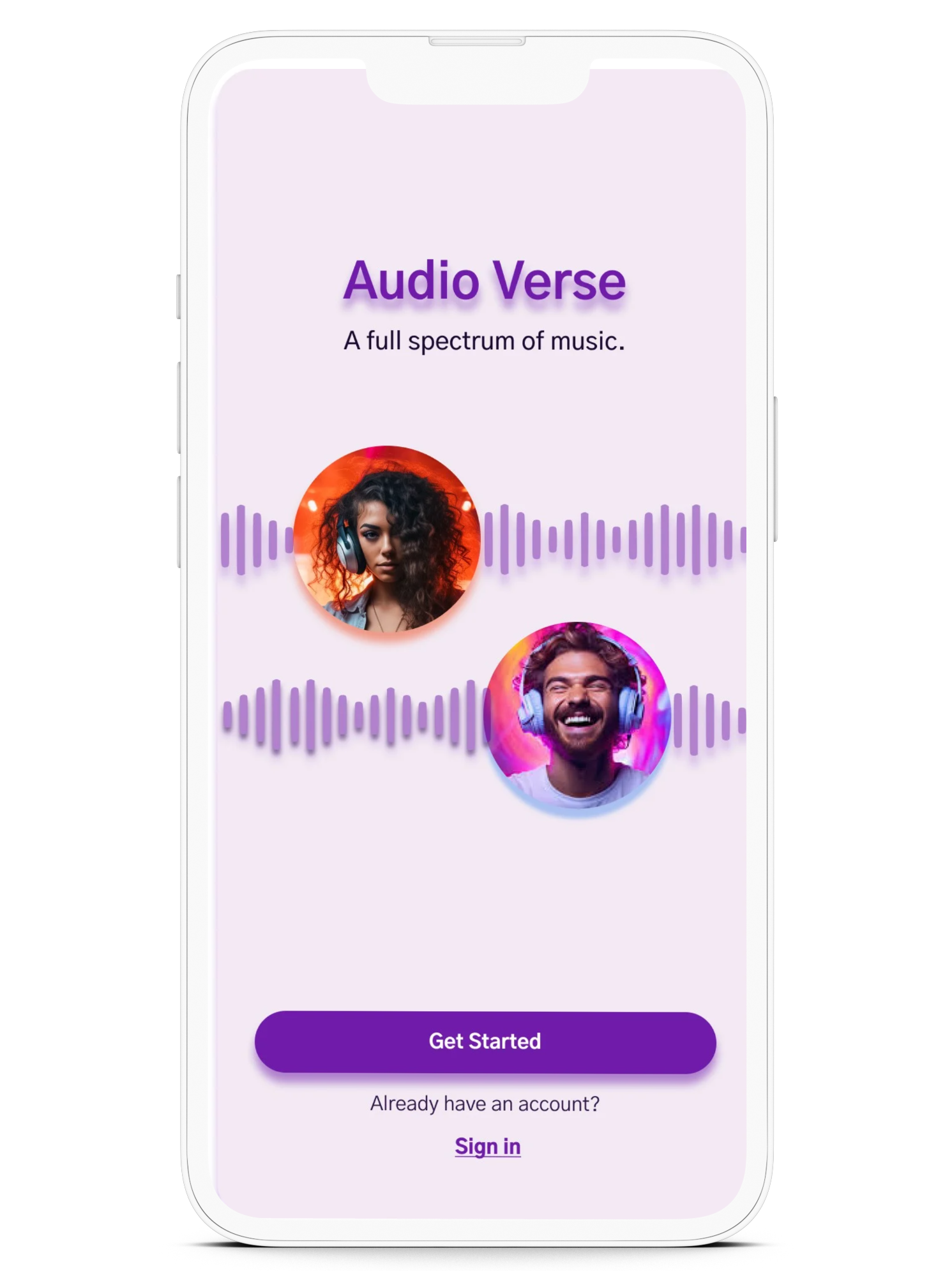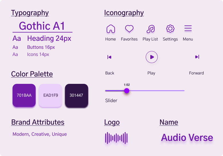 I designed the app's style guide for a creative, contemporary appeal across age groups, balancing youthful lavender with mature royal purple. The name Audio Verse reflects diverse music content, reinforced by a soundwave logo for an engaging auditory experience. Sleek line icons enhance the streamlined aesthetic.