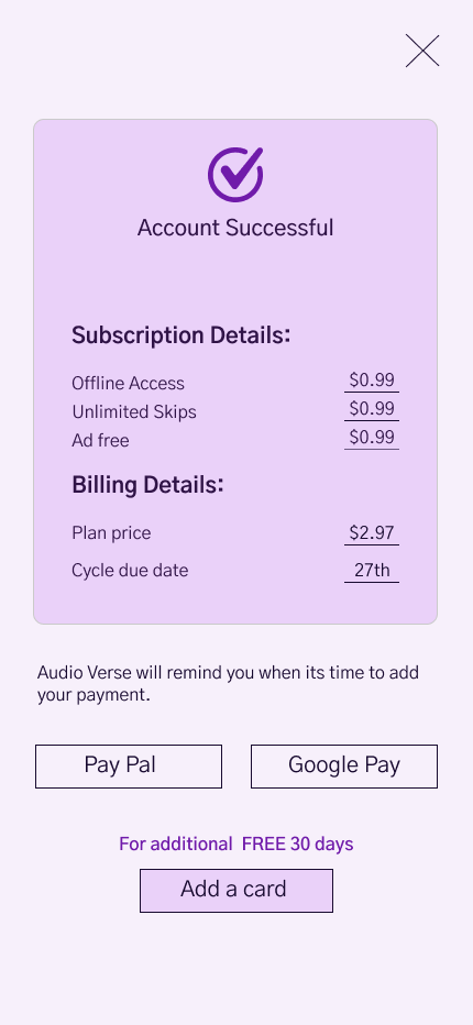 The research and usability testing for Audio Verse yielded valuable insights into user preferences, especially in the free-to-paid conversion process. Key findings highlighted areas for optimization to improve user conversion, engagement and satisfaction. Interface changes effectively guided users through the freemium-to-premium transition. The fixed premium price garnered interest, emphasizing cost-effectiveness and users appreciated the concept of a customized plan.