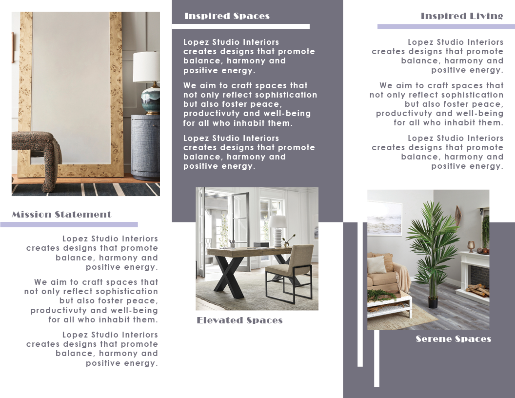 A trifold brochure focused on interior design, specifically emphasizing a feng shui-inspired aesthetic. My goal was to create a minimalist modern design that conveys harmony and balance. I used neutral grays, intentional white space and clean, modern typography to evoke a calm and curated visual experience. I chose the trifold format to allow for a clear flow of content across six cohesive panels that spans from front cover to inner content to back panel.
