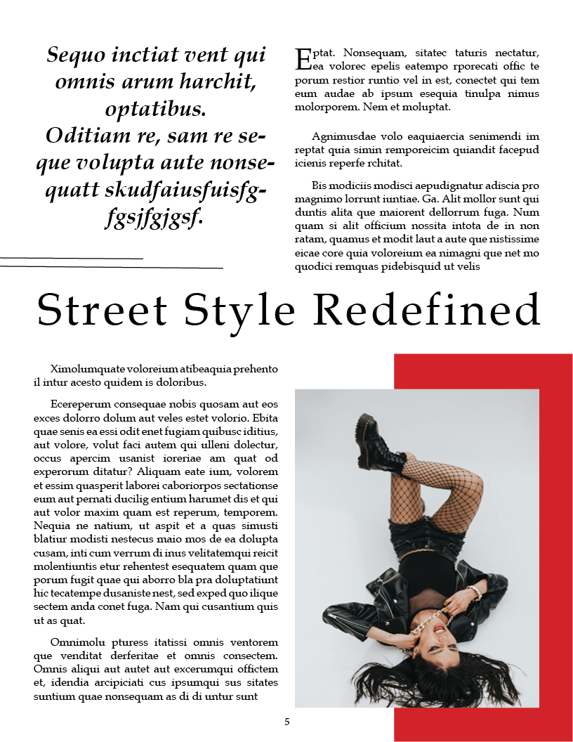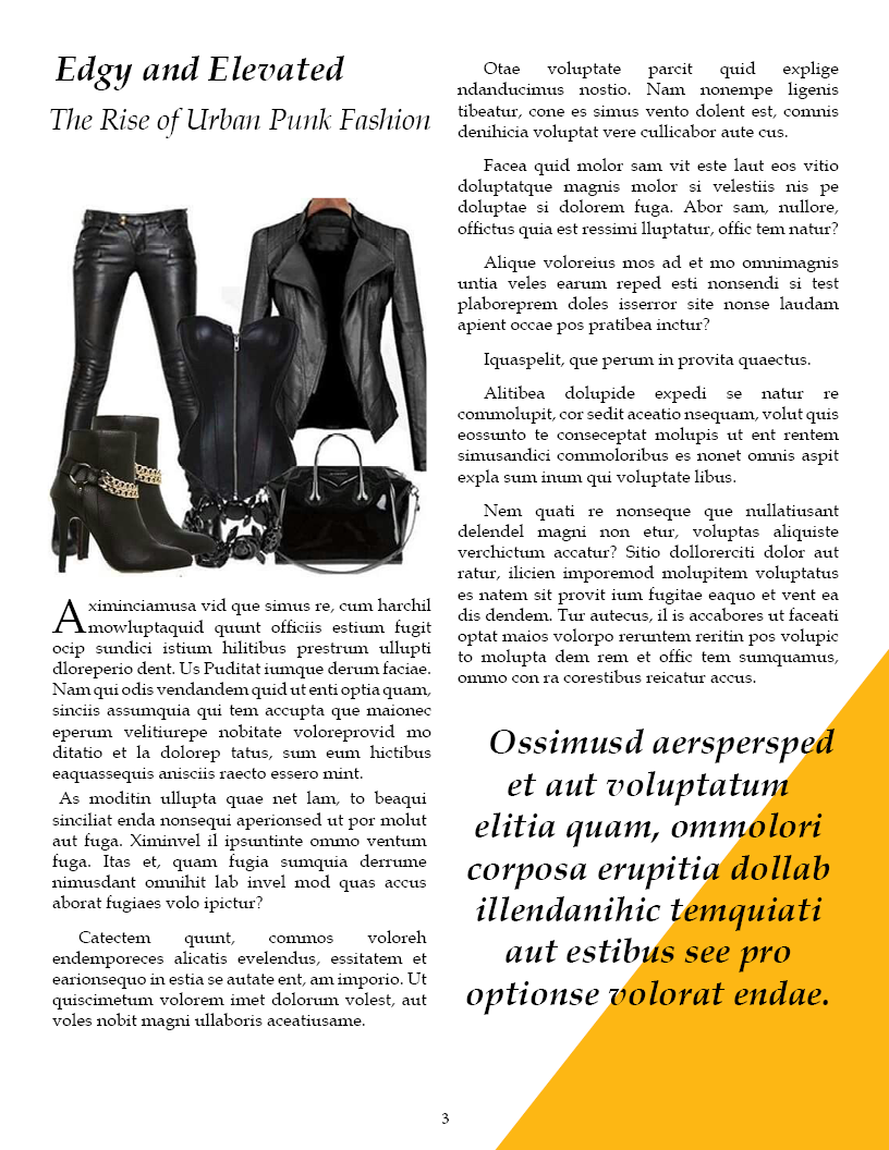 This project is a multi-page fashion magazine designed to explore bold editorial layout techniques and expressive visual storytelling. Inspired by modern punk aesthetics, I used a mix of bright colors, full-bleed imagery and bold typographic treatments. The magazine layout includes layered color blocks, expressive image placement and a wrapped article to balance visual rhythm with readability. My goal was to create a visually engaging print piece that blends high fashion with rebellious energy.